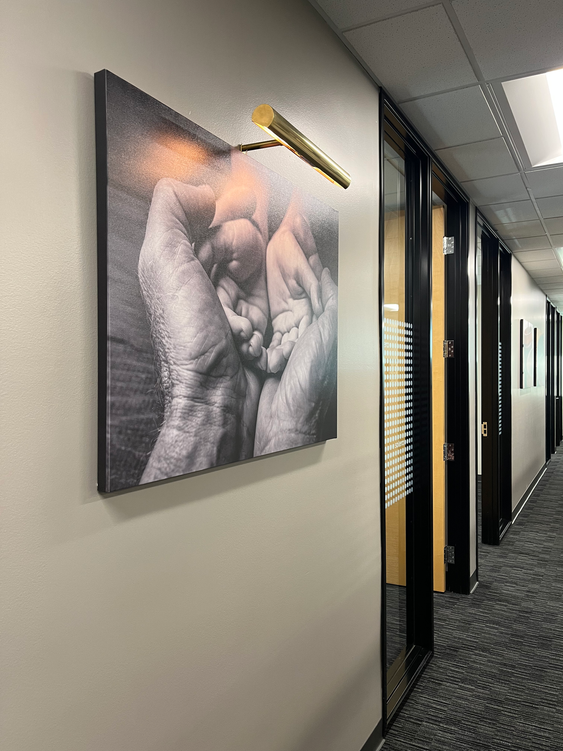 The focal point wall in the lobby features wood paneling and LED lit brushed gold logo lettering. Conference room chairs accord with the wood tones on the focal wall, providing comfortable seating and visual harmony. Custom imagery throughout the office tells the story of the brand roots and its meaning.